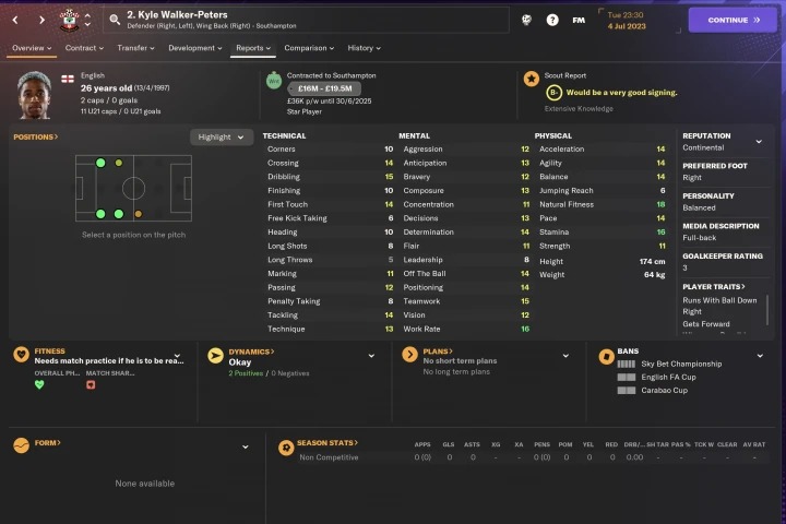 Contract talks with Southampton have stalled, meaning Kyle Walker-Peters could become a free agent this summer. He’s a dream signing for almost every Premier League team. He’s homegrown, excels in attack and defense, and can play as a wing-back on either side. The perfect versatile squad player. If he ends up without a club in FM25 or FM26, he’ll be the first name on my transfer list.