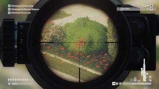 Hardware to one side, we're also given a few intangible gifts: a gentle squeeze of the right trigger makes time flow like syrup off a spoon, allowing you to line up shots with divine intervention; and the world, seen from such distance, is completely quiet, which means you paste your own stories over pantomime gestures. Indeed, this mission saw one of my targets, Doris Lee, nursing what I took to be a cocaine addiction – otherwise, why all the scurrying off into secluded rooms? Another one, from the snowy sweep of his hair, was the spit of Donald Sutherland, and with his scarf flowing over his shoulders like papal robes, I imagined him embroiled in a Vatican conspiracy. It helps not to hear the NPC chatter; it's always about something dull, like arms dealing.