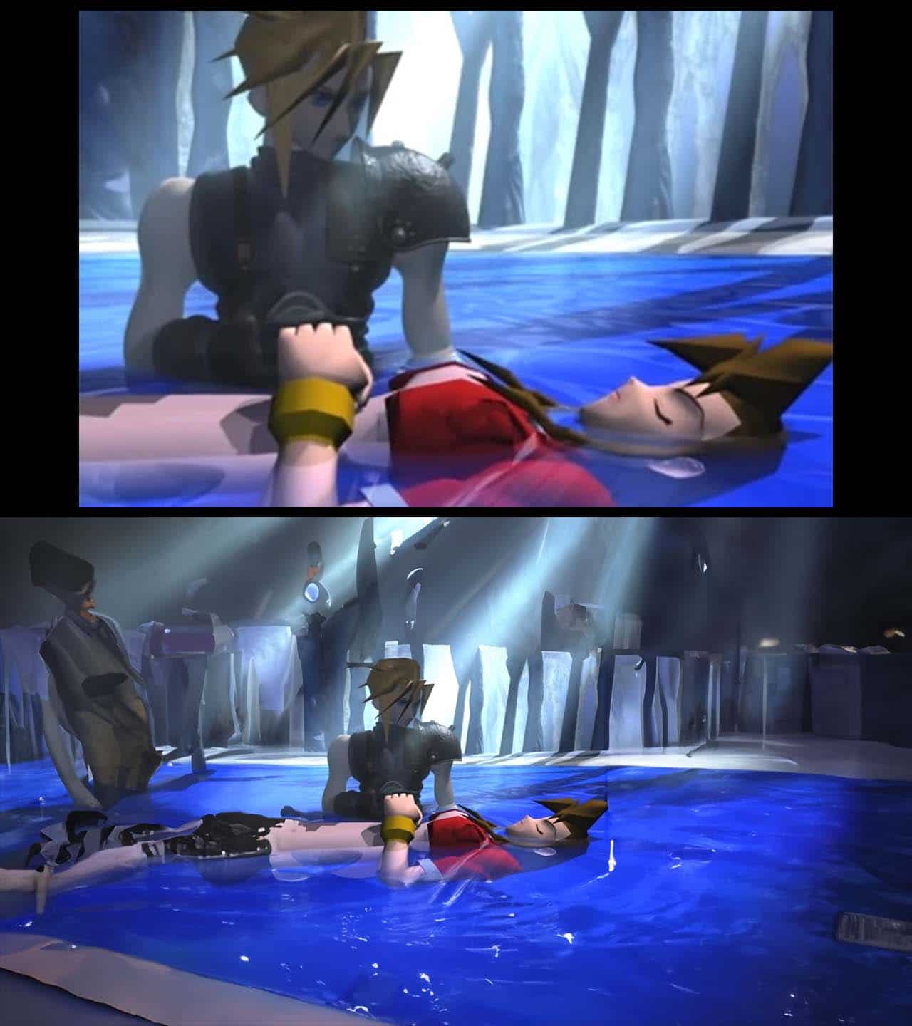 The first scene we wanted to recreate was – spoiler alert – Aerith’s iconic death scene from Final Fantasy VII. The game holds a special place in many of the hearts at VideoGamer, so it seemed an appropriate place to start. Or at least, we thought so. Generative fill did a good job at rendering the water, in fact, dare I say, it looks even better in the AI-generated parts. However, Cloud’s mourning is slightly undermined by the anthropomorphic figure looming over the scene. Whatever this thing is, we don’t want to know. At least it turned up though.