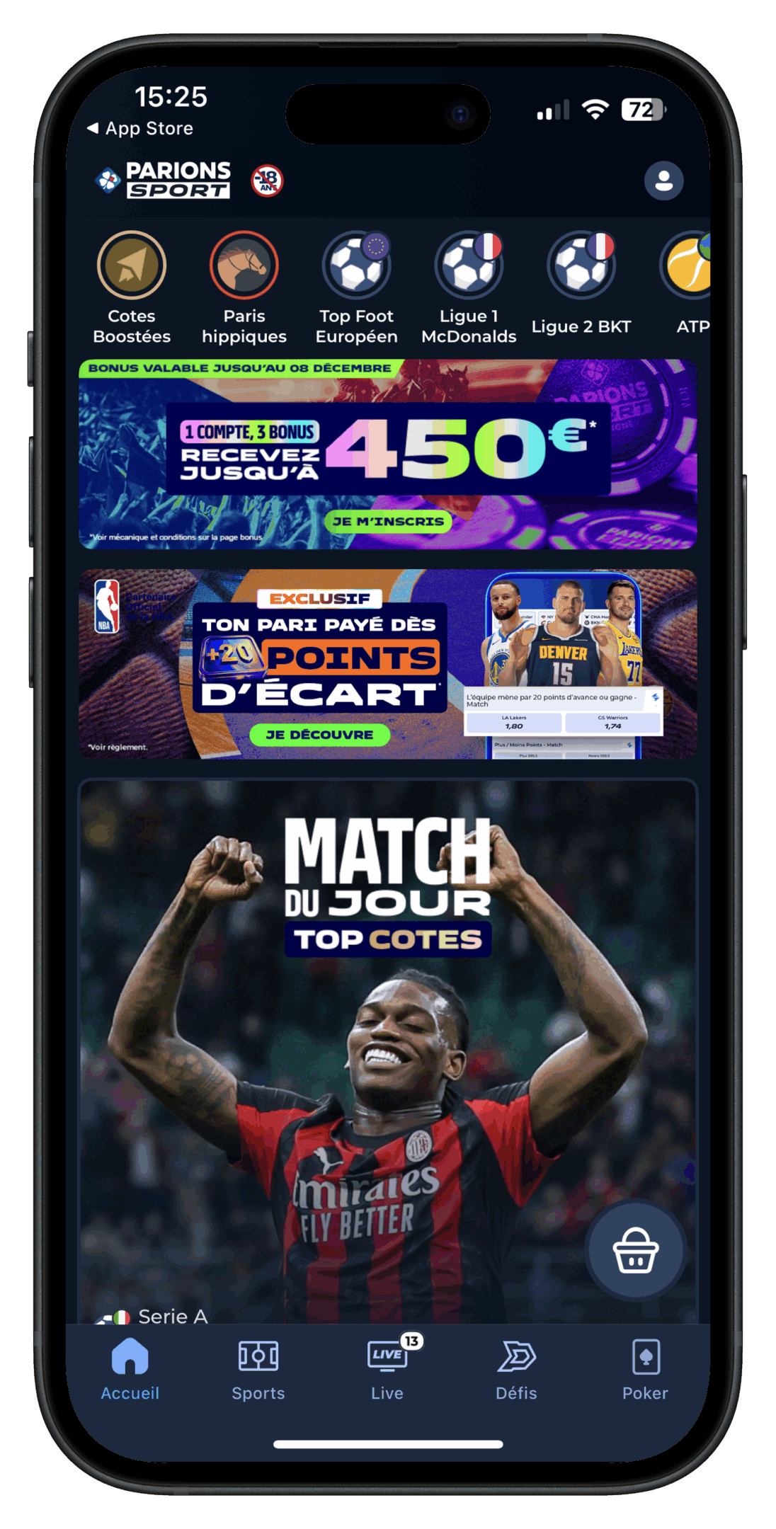 Parions Sport propose un triple bonus de bienvenue, avec jusqu’à 100 euros sur les paris sportifs, 100 euros sur le turf et jusqu’à 250 euros sur le poker. Pour créditer votre compte Parions Sport, plusieurs possibilités : virement bancaire, carte bancaire mais aussi Apple Pay, PayPal ou Paysafecard.