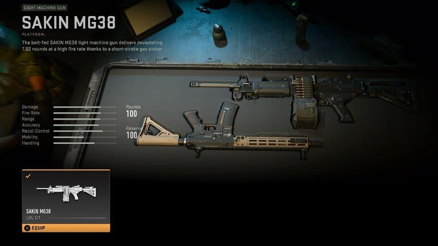 The belt-fed Sakin MG38 light machine gun delivers devastating 7.62 rounds at a high fire rate thanks to a short-stroke gas piston. In Modern Warfare 2, the Sakin MG38 offers more ammo capacity than others of its type. While it provides solid stats in Range, Fire Rate, and Recoil Control, its Mobility suffers a substantial toll, which could hamper its performance in combat. Nevertheless, those who become accustomed to how the weapon “feels” in battle in Modern Warfare 2, will be able to utilize its large ammunition capacity to wreak havoc on their enemies.