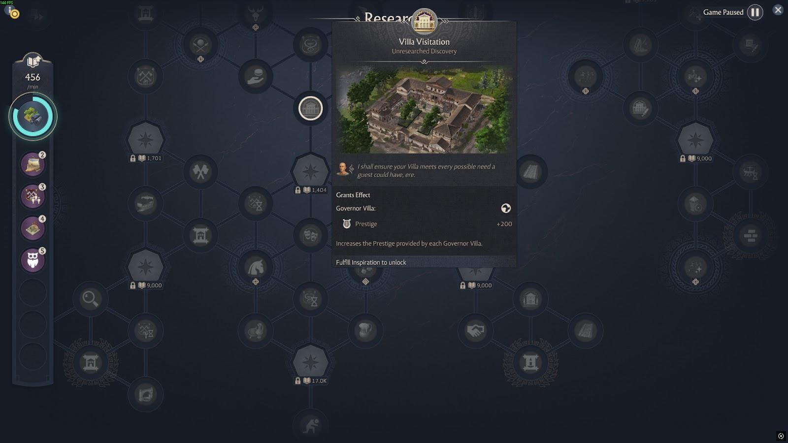 Specific Discovery nodes in the Research tree offer a boost to your city’s Prestige, usually in large amounts. For example, there’s Villa Visitation under the Civic branch, which grants a +200 increase to the Prestige provided by the Governor Villa.