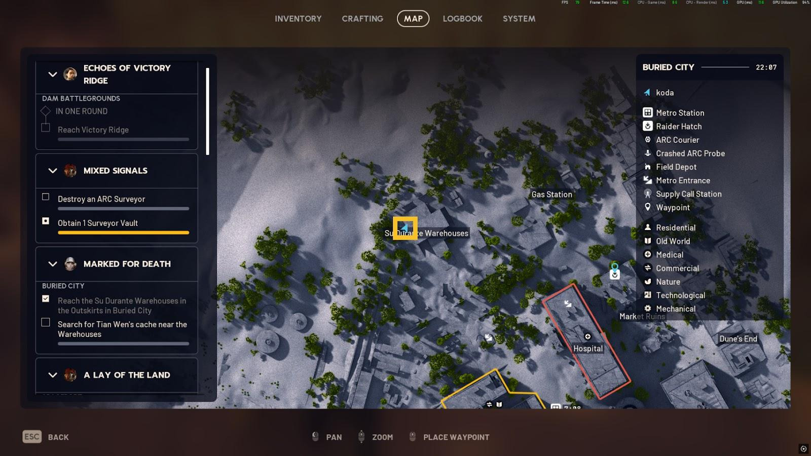 Make your way over to the Su Durante Warehouses, which are located in the northwest of Buried City, northwest of the Library and Hospital buildings, and southwest of the Gas Station. Fingers crossed your spawn isn’t down by the church on the other side of the map. Entering the area around the Su Durante Warehouses from any direction will complete this starting objective.