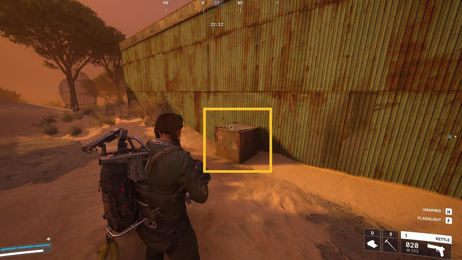 To find the cache, don’t go inside the warehouse buildings; instead, march over to the western side of the main building. Follow the outer wall northwest, and you’ll spot a rusty crate. Refer to the map image above for the exact location. As you approach, you’ll see a yellow interact prompt that reads ‘Investigate’.