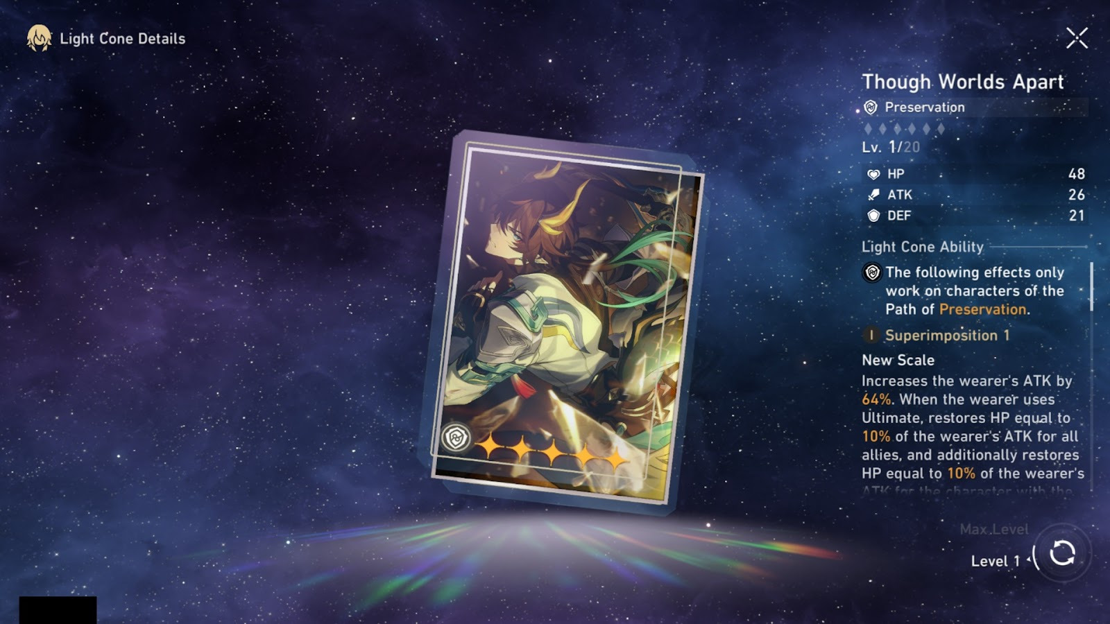 Worlds Apart is the signature option for Dan Heng Permansor Terrae and is needed if you want to fine-tune the character to perform at his best. It increases your ATK by 64 percent. Additionally, after using the Ultimate ability, you’ll restore the HP of all allies by 10%.