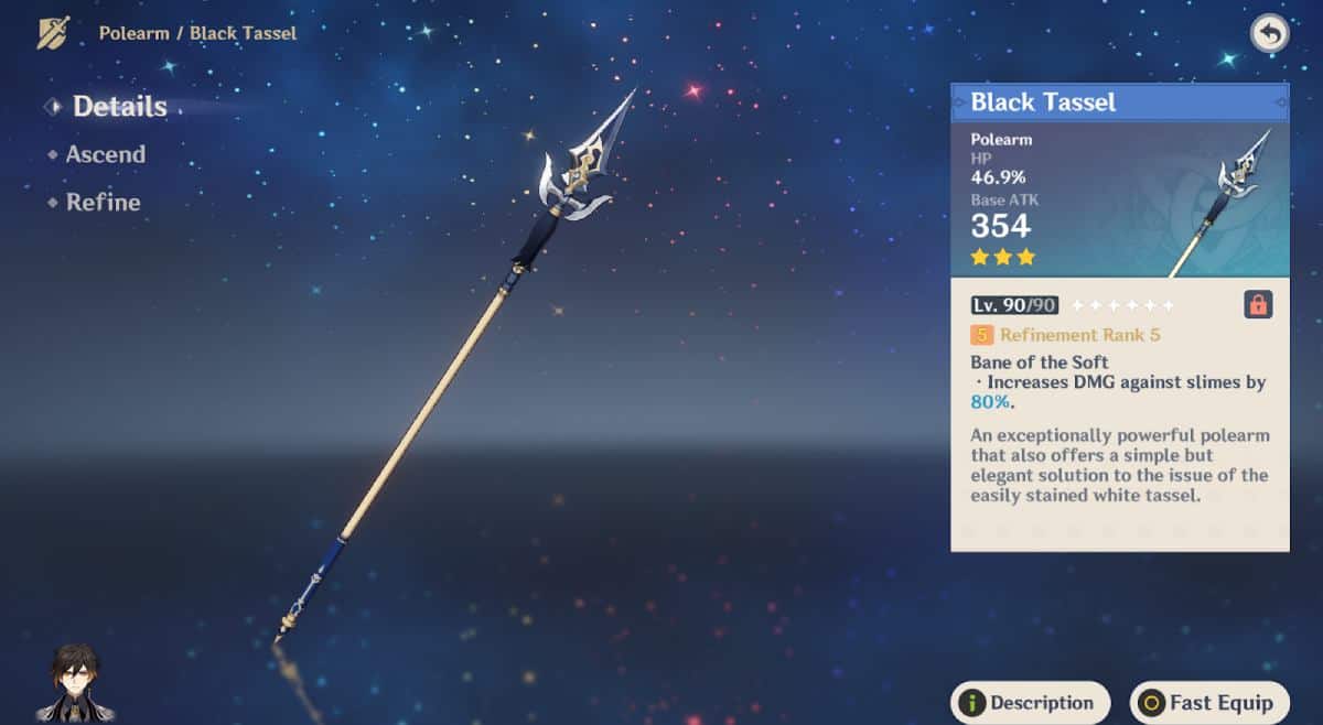One of the most easily obtainable Polearms in the game is the Black Tassel. If you wish to stack HP on a Polearm character, this is the only option with an HP% second stat currently in the game. This 3-star weapon might already be lying in your inventory in quantities more than one, and even if not, you won’t have to worry about grinding for it since you’ll get it from wishing quite easily.