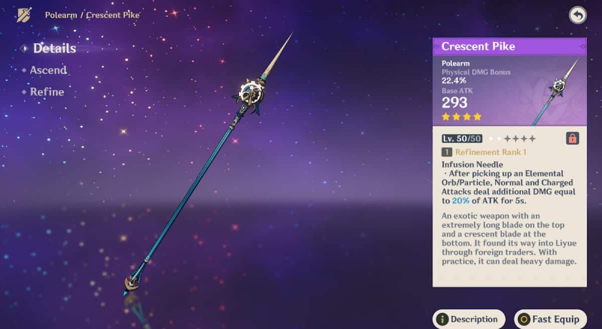 Another option for any Physical DMG character (Mika included) is the Crescent Pike, which can be crafted at the blacksmith’s shop. In contrast to how easily you can obtain this weapon, it can still prove to be very advantageous for Mika. For his Physical build, the Crescent Pike can increase 34.5% Physical Damage Bonus while also giving 565 Base ATK along with 20% ATK as DMG every time he collects particles!