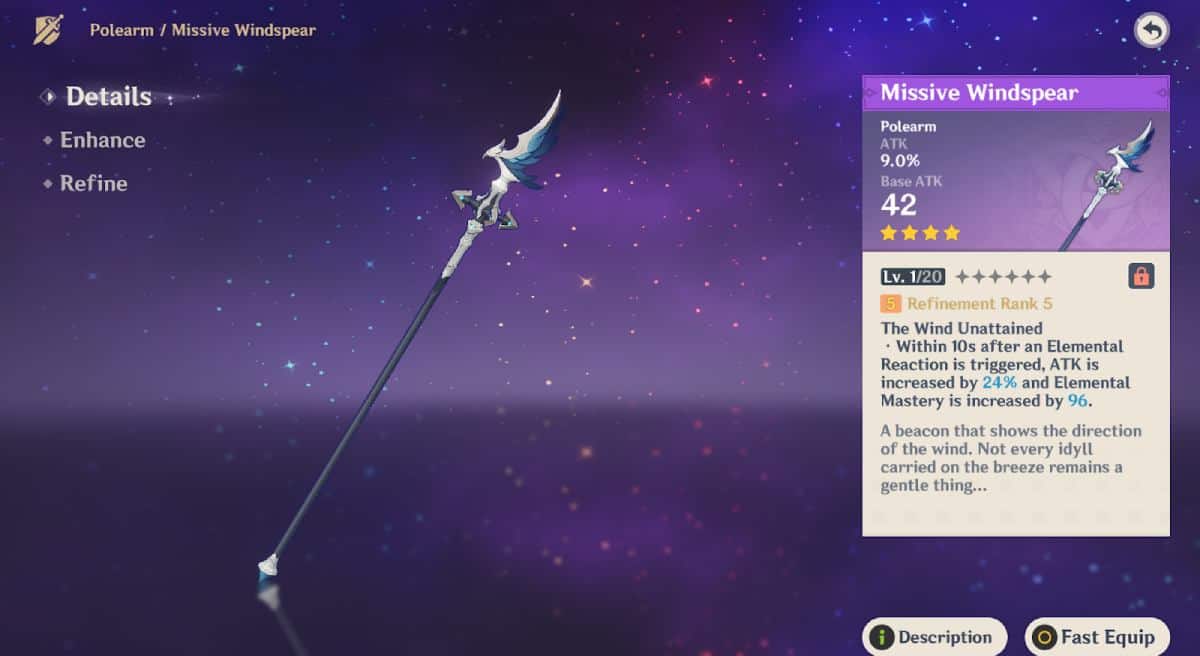 Looking into the Polearm’s Passive: The Wind Unattained, if you manage to proc Elemental Reactions with Mika’s Cryo effects, you can receive a further increase in ATK (12% ATK increase and +48 EM). Even though this passive is decent, don’t forget that Mika has a really low Cryo application, which makes it difficult to trigger the weapon’s Passive frequently. Conversely, running Mika in a reaction team can make the weapon work loads!