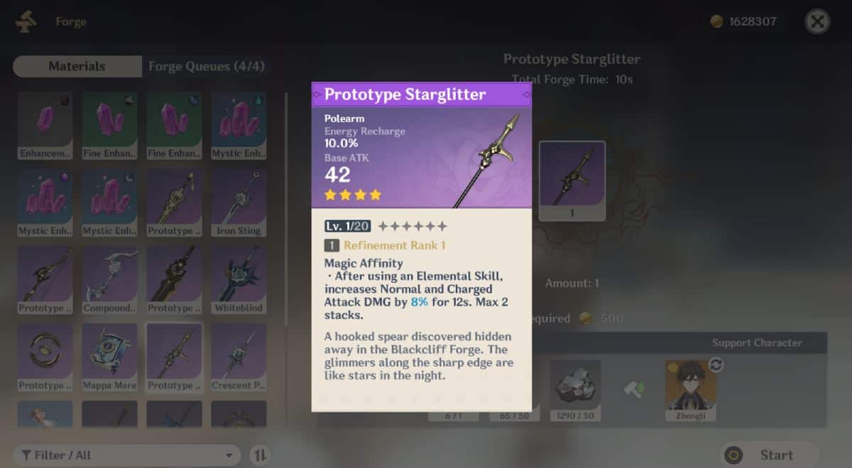 The Prototype Starglitter provides the wielder with 45.9% Energy Recharge alongside 510 Base ATK at level 90. This weapon stands second to the Favonius Lance in ER stats as far as Mika’s healer build goes. However, we should preface that its Passive is more viable for a DPS Mika than a Support/Healer Mika since it grants an 8% increase in Normal/Charged Attack DMG by using a Skill.