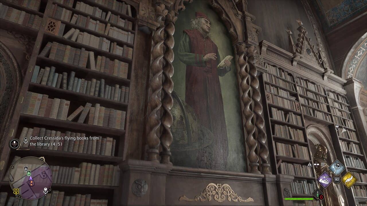 Fast Travel to the Library Floo Flame. Climb the stairs straight ahead to the floor above. Take a left, then another left and follow the balcony to the back of the library. Take a right when you see a short flight of stairs on your left. Use Lumos on the moth mirror ahead. Run back to the painting of the man in the red tunic at the top of the stairs you just came from to find the moth. Escort it back to the mirror.