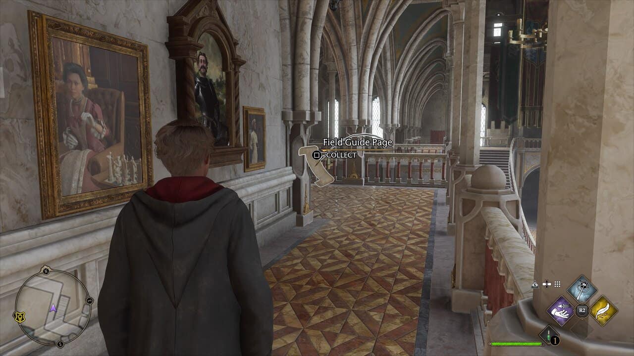 Fast travel to the Divination Classroom Floo Flame. Take the stairs down one level, then go straight a little and take the stairs down on the left. Run across the hall and climb up the stairs straight ahead. Turn right and the Field Page is in front of a talking painting of a man in a suit of armor.
