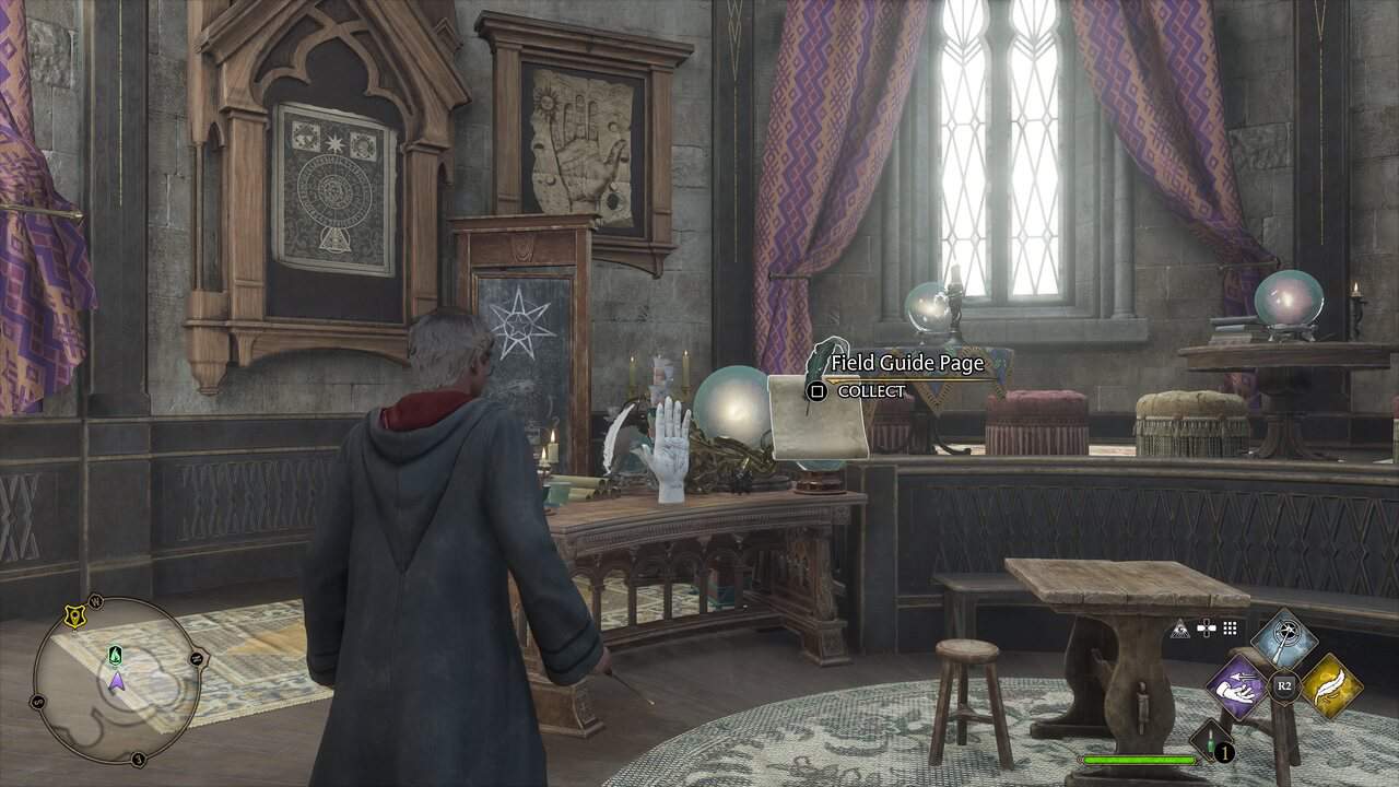 Fast travel to the Divination Classroom Floo Flame. Take a left into the rafters above the hall. Follow the wooden walkway and take the first right until you reach an animal symbol door. Solve the puzzle (if you need a hand check out our dedicated guide). Head up the stairs into the Arithmancy Classroom. The Field Guide Page is just in front of you as you enter.