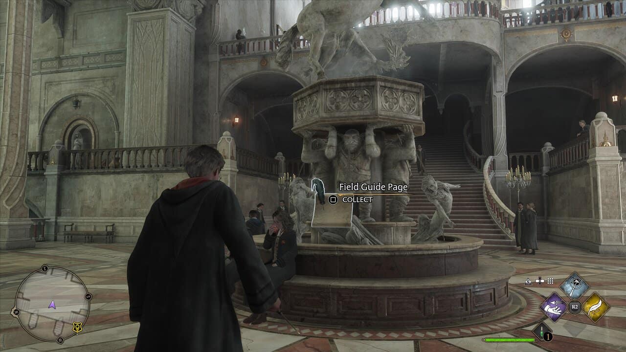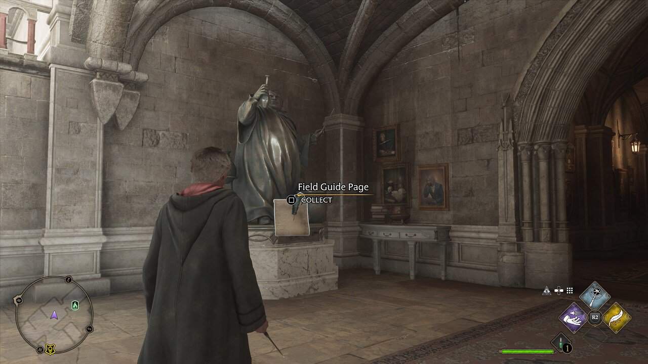 Fast travel to the Central Hall Floo Flame. Descend the stairs to the fountain and take a right down another set of stairs. Turn right and use Alohomora to unlock the door. Cast Levioso on the statue inside the room to get the Field Guide Page.