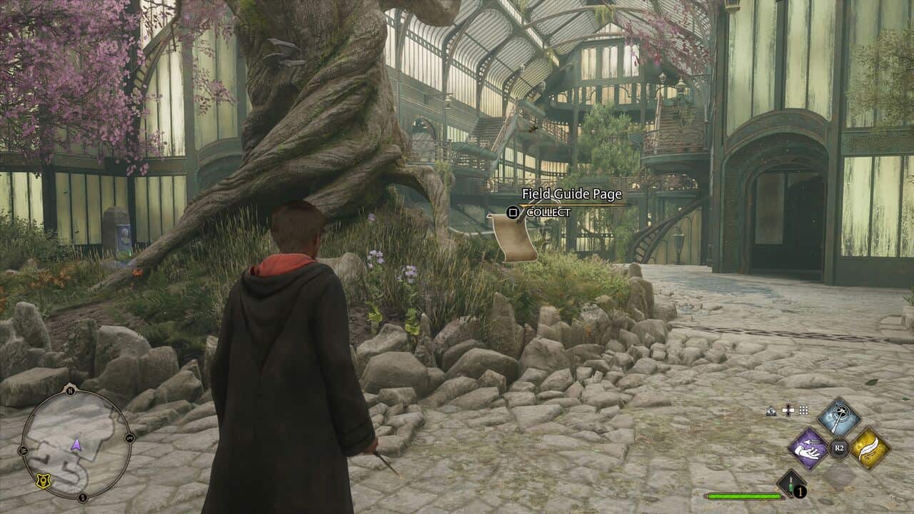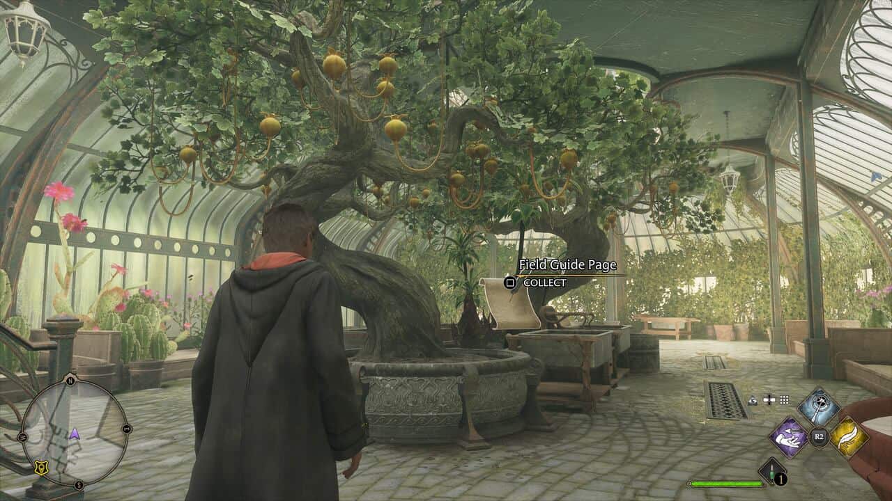 Fast Travel to the Greenhouses Floo Flame. Walk straight into the doorway ahead. Immediately go through the door on your left. To the right of the tree at the bottom of the stairs is the page.