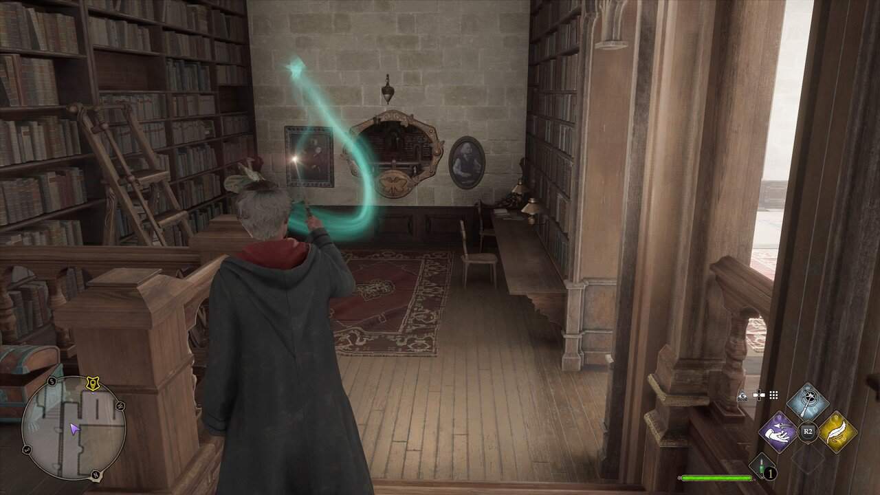 Fast travel to the Library Floo Flame. Head left and then take a right into the Restricted Section. Drop down two floors until you come to a door into the basement. Go through, down the short flight of stairs and cast Levioso on the statue just ahead.
