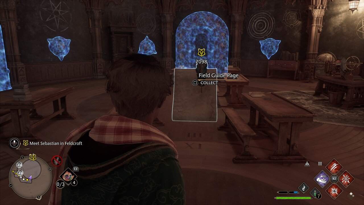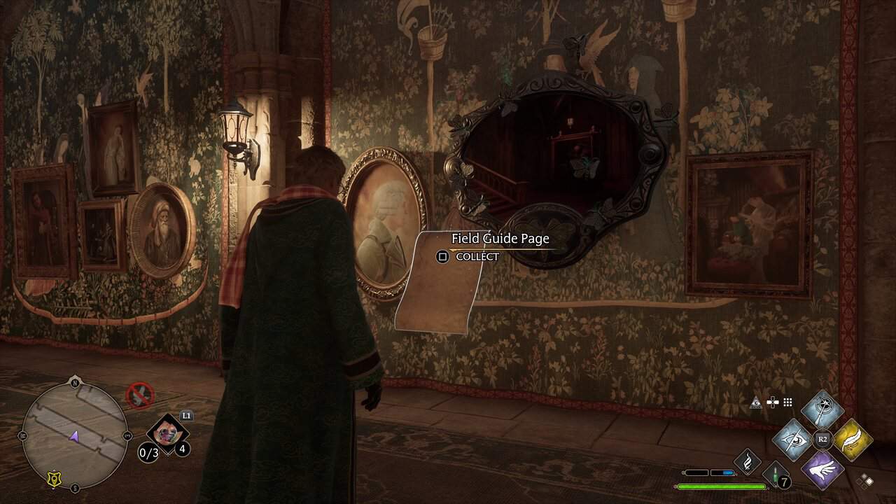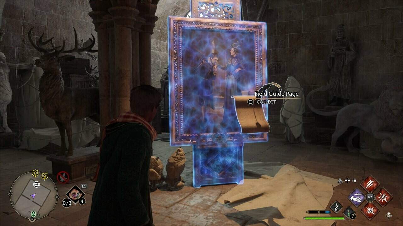 Fast travel to the Potions Classroom Floo Flame. Head through the double doors ahead, then take a left down the spiral staircase. Follow the path until you come to a door on your left. Cast Alohomora to open it. Run to the end of the corridor and just before the flight of stairs, take a left. Solve the animal symbol door puzzle. Inside you’ll find a painting. Cast Revelio to reveal the Field Guide Page.