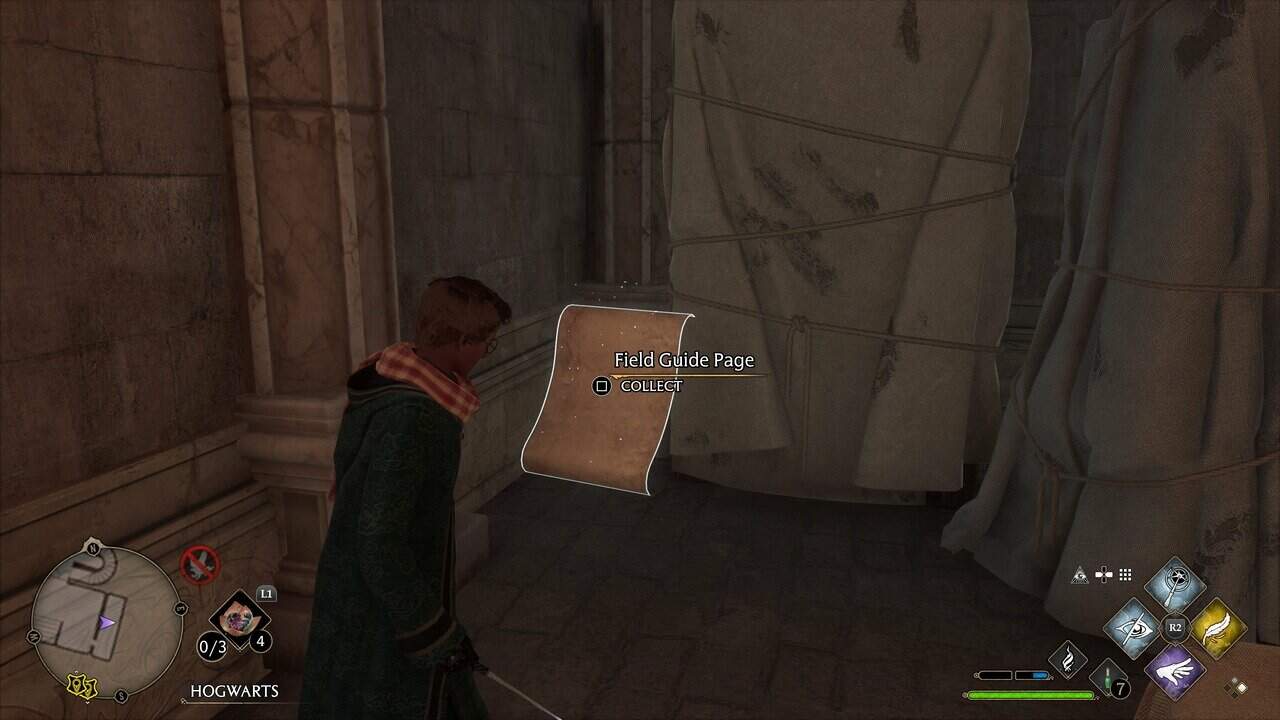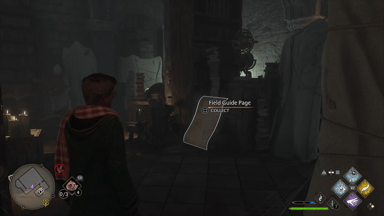 Fast travel to the Potions Classroom Floo Flame. Head through the double doors ahead, then take a left down the spiral staircase. Follow the path until you come to a door on your left. Cast Alohomora to open it. About halfway down the corridor, you’ll find a moth painting on the right. The moth is further up the corridor to the right of the flight of stairs on top of a troll in a glass case. Bring it back to the painting and uncast the spell to reveal the Field Guide Page.