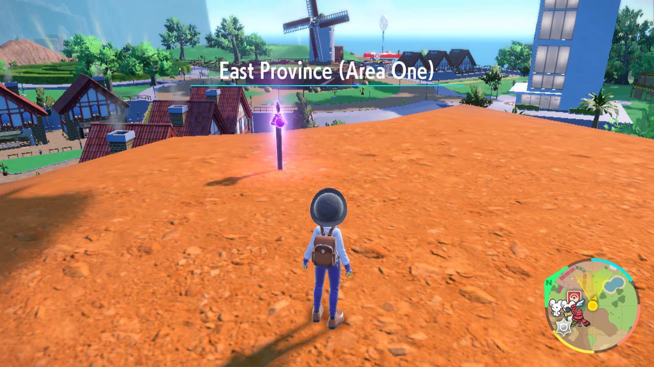 This Stake is located to the east of Mesagoza in the South Province desert. Located atop another hill, the Purple Stake is overlooking a Pokemon Center and the Mesagoza to its west.