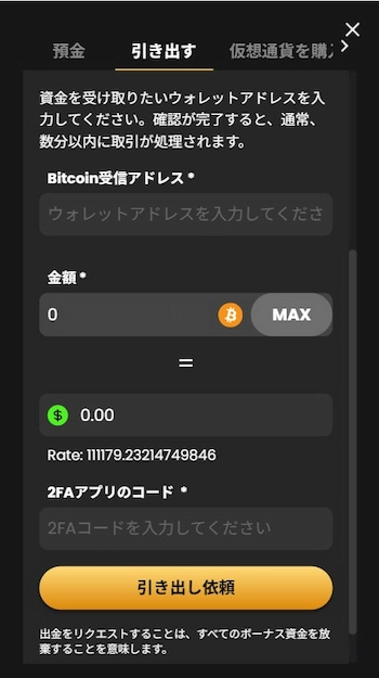 ゲームで勝った賞金を出金します。出金画面で希望の通貨を選び、取引所の入金アドレスを出金先欄に貼り付けます。出金額を入力して出金手続きの完了です。
