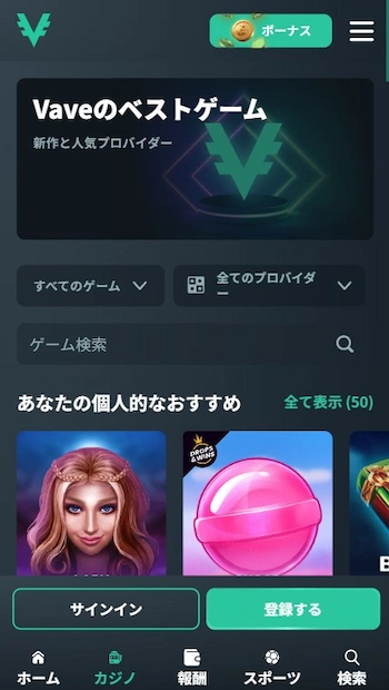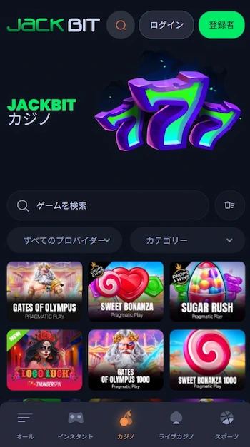 Pragmatic Play、Evolution、Hacksaw Gamingといった大手企業をはじめとする56社のゲームプロバイダーのゲームを収集。大人気のパチンコ・パチスロは常時150種以上揃っており、さらに日本語対応のライブカジノやスロット、ビンゴゲームなど多彩なジャンルを楽しめます。