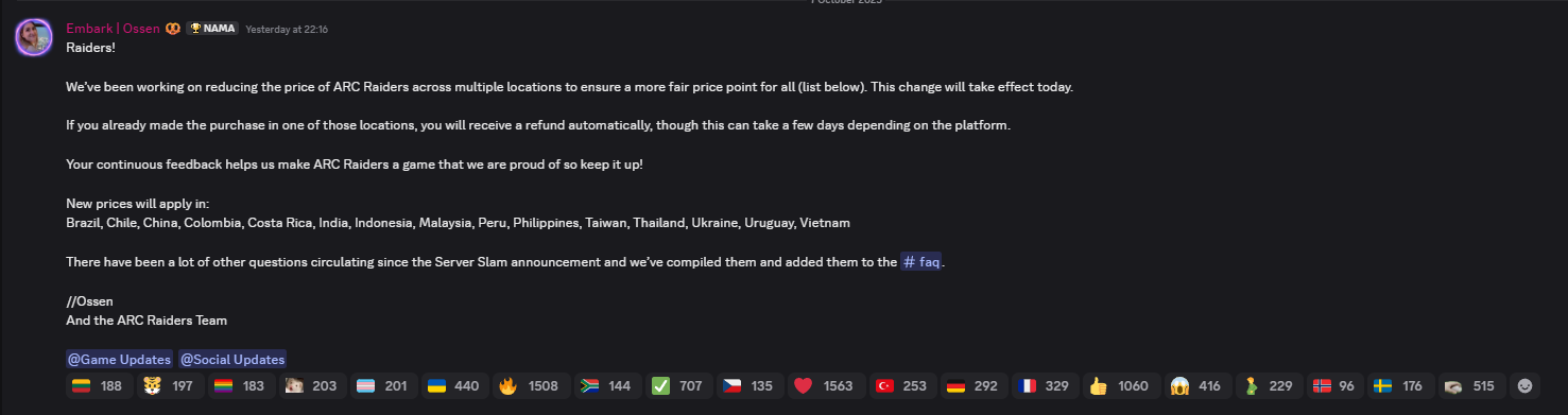 On the official Arc Raiders Discord Channel, Embark Ossen has announced that Embark have “been working on reducing the price of ARC Raiders across multiple locations to ensure a more fair price point for all [and] This change will take effect today [October 7th]”.