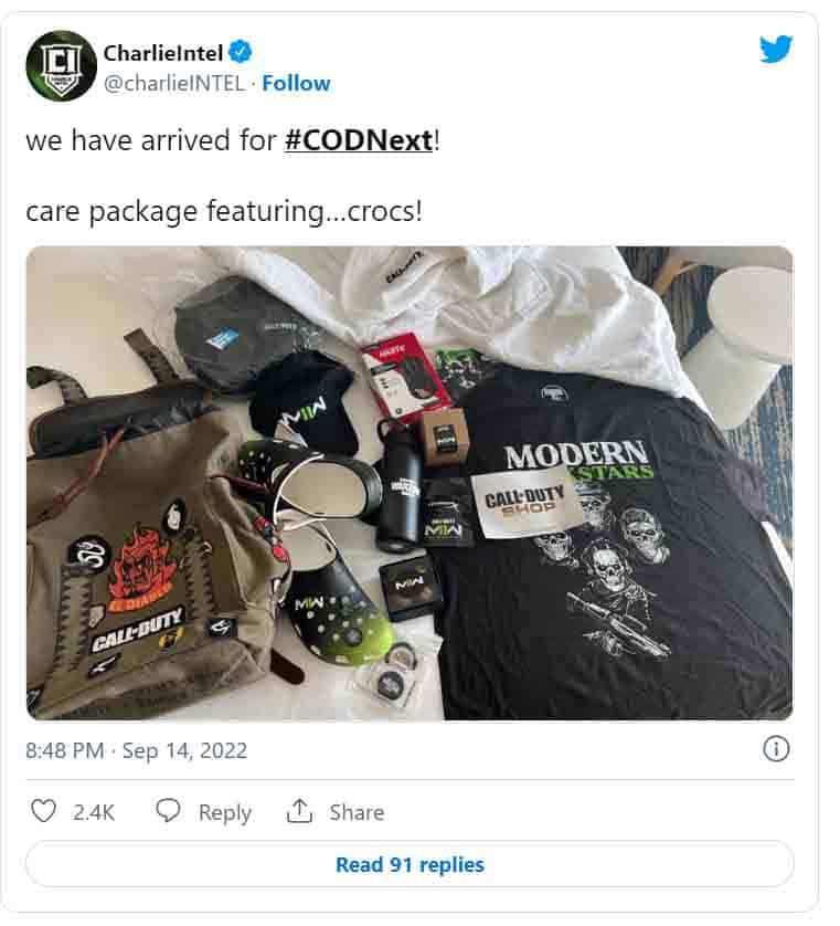 As tweeted by CharlieIntel, their care package includes bags, dressing gowns, mice, flasks, merch and even Crocs.