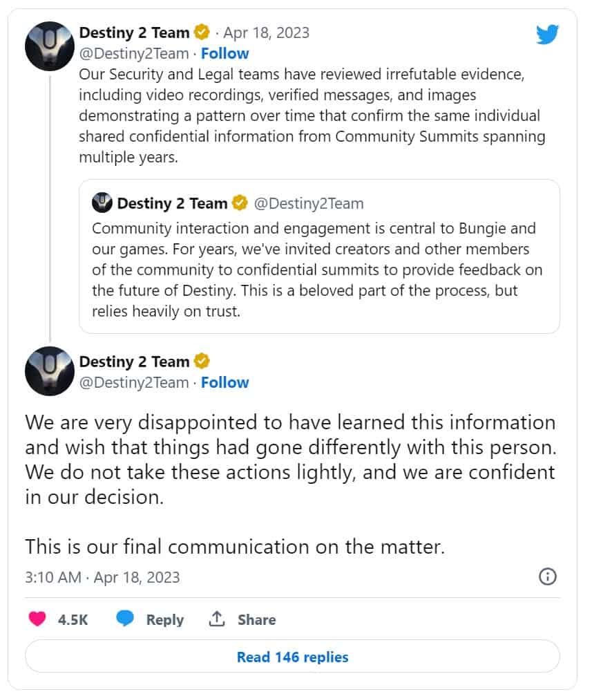 “Community interaction and engagement is central to Bungie and our games,” it tweeted. “For years, we’ve invited creators and other members of the community to confidential summits to provide feedback on the future of Destiny. This is a beloved part of the process, but relies heavily on trust. Breaches of this trust could result in our inability to hold more summits. We take these breaches extremely seriously and are taking actions to reinforce our policies with those invited to these internal meetings.”
