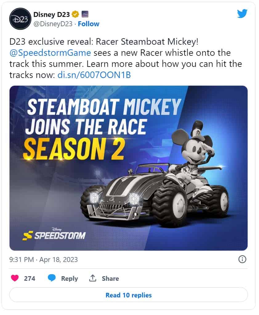 Revealed on the D23 Twitter, that racer will be none other than Steamboat Mickey – a version of Mickey Mouse based on the character’s first appearance in the black and white cartoon Steamboat Willie released back in 1928. The tweet also claims that the character will be released in Season 2, which is expected to arrive in the summer.
