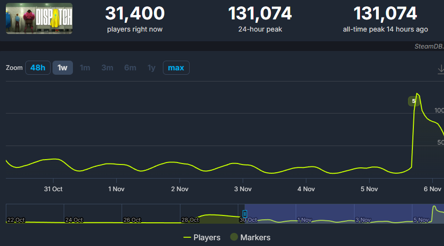 This player count is extremely impressive, and it’s likely to be broken with the release of Episodes 7 and 8 on November 12th. This is when Dispatch will be fully complete with all episodes out, so we expect more gamers to hop aboard the bandwagon.