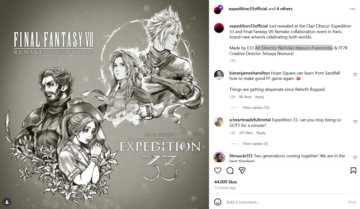 As revealed by the official Clair Obscur Expedition 33 Instagram account, the joint fan event was in Paris. To honor both games, Square Enix and Sandfall Interactive collaborated on some neat artwork. Sandfall Interactive paid respect to Final Fantasy with Art Director, Nicholas Maxson-Francombe, putting his spin on Cloud and Aerith, meanwhile, Final Fantasy 7 Remake Creative Director, Tetsuya Nomura, created his version of Maelle and Verso.