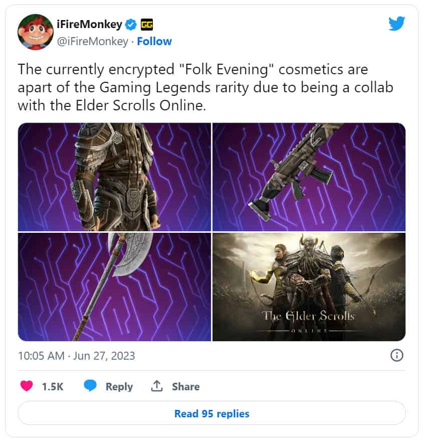 That’s according to images datamined by prolific Fortnite fan Twitter account iFireMonkey, who dropped some images of a number of TSO Fortnite cosmetics that are believed to be coming to the store in the near future. They include a character adorned in the classic Elder Scrolls Norse-inspired garb, complete with horned helmet. The images also include a weapon skin, and an axe that’s believed to be the stylings of the pickaxe. According to the account, they’re currently labelled under a ‘Folk Evening’ collection, though it’s not currently clear if there’ll be a glider or emote to go with them.