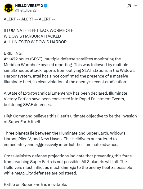 On X, Arrowhead has warned that the invasion of Super Earth is inevitable. Per the developer, “Three planets lie between the Illuminate and Super Earth: Widow’s Harbor, Pilen V, and New Haven,” and “All 3 planets will fall” as “Cross-Ministry defense projections indicate that preventing this force [the Illuminate] from reaching Super Earth is not possible”.