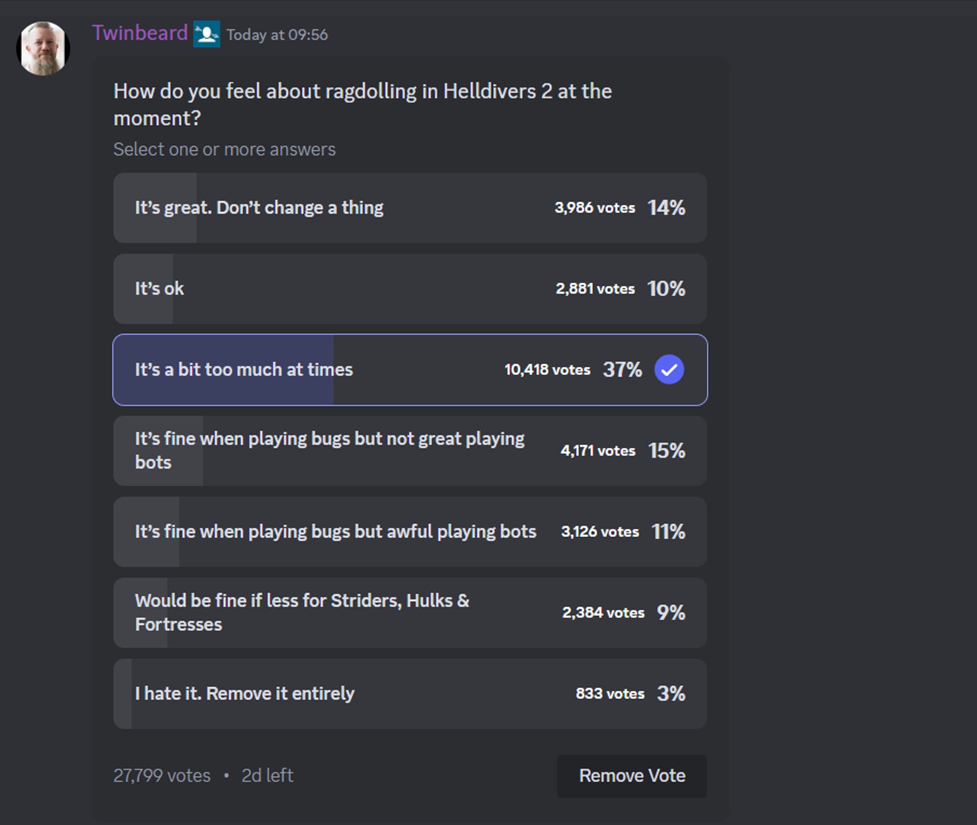 On the official Helldivers Discord, community manager, Twinbeard, has started a poll which asks “How do you feel about ragdolling in Helldivers 2 at the moment?”. The options are as follows: