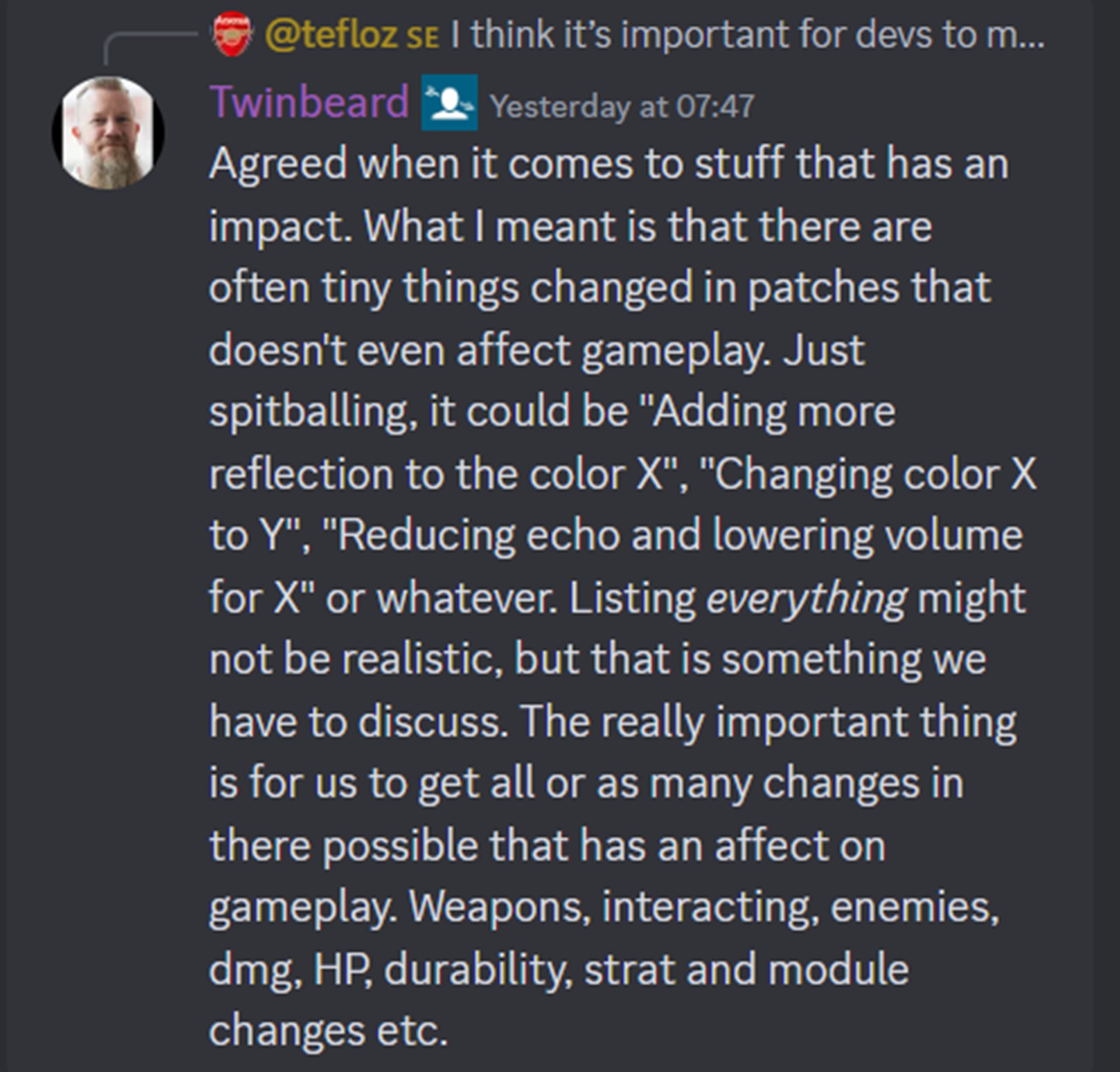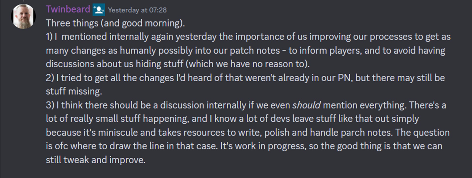 As for why not everything is listed in patch notes, Twinbeard explained, “There’s a lot of really small stuff happening, and I know a lot of devs leave stuff like that out simply because it’s miniscule and takes resources to write, polish and handle patch notes. The question is ofc where to draw the line in that case”.