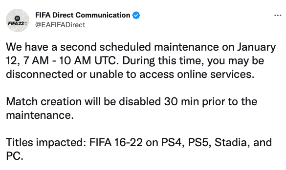 On the 12/01/2023, FIFA 23 was down for scheduled maintenance, although it is now back up and running ready to play.