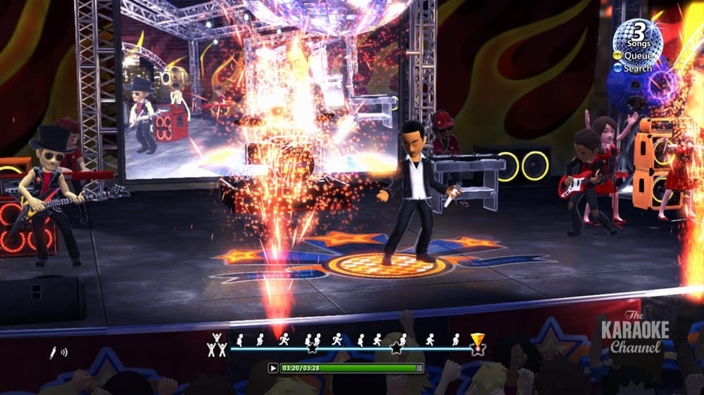 The pay-to-play service – access to the entire library of over 8,000 songs is available for blocks of 2, 6 or 24 hours by redeeming Microsoft Points – offers scrolling lyrics on screen while the player avatar performs the song on stage complete with stage props, backup band and audience.