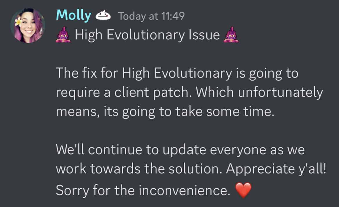 An update did indeed come a few hours later, but it wasn’t quite the news fans wanted to hear. “The fix for High Evolutionary is going to require a client patch. Which unfortunately means, it’s going to take some time. We’ll continue to update everyone as we work towards the solution. Appreciate y’all! Sorry for the inconvenience.”