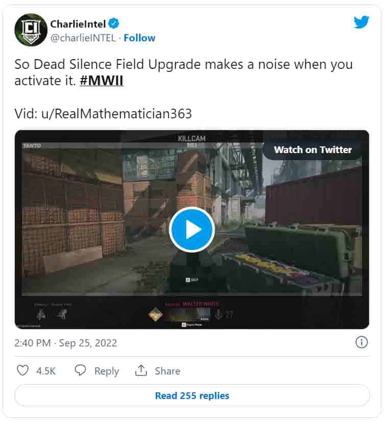 As noted by CharlieIntel (and user u/RealMathmatician363 on Reddit) the Dead Silence perk (now technically a Field Upgrade) makes a rather loud noise when it’s activated.