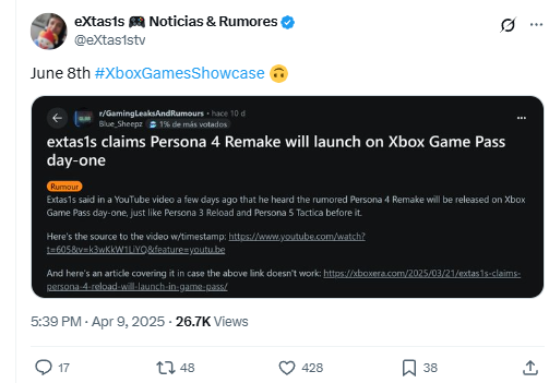 Often-reliable Xbox and Game Pass leaker, extas1s, has recently claimed that the much-rumored Persona 4 Remake will be dropping day one on Xbox Game Pass. This wouldn’t be too surprising as Persona 3 Reload was available on Game Pass from day one of its launch at the beginning of 2024.