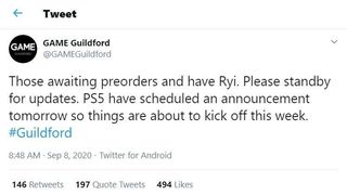 As reported by our friends at PlayStation Trophies, the Twitter account of UK retailer GAME's Guildford branch tweeted to those that had pre-ordered PlayStation 5 to "standby for updates. PS5 have scheduled an announcement tomorrow so things are about to kick off this week."