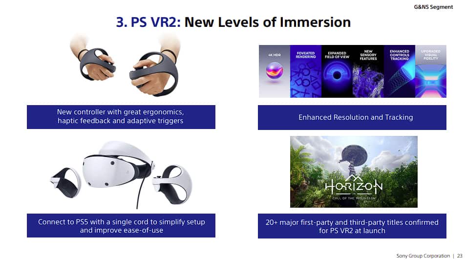The declaration appeared in the latest Sony Business Segment Briefing spotted by Video Games Chronicle. In the segment, Jim Ryan claims the headset already has “20+ major first-party & third-party titles confirmed for PS VR2 at launch”. While it didn’t say what these titles were specifically, the slide did include the previously-announced Horizon: Call of the Mountain.
