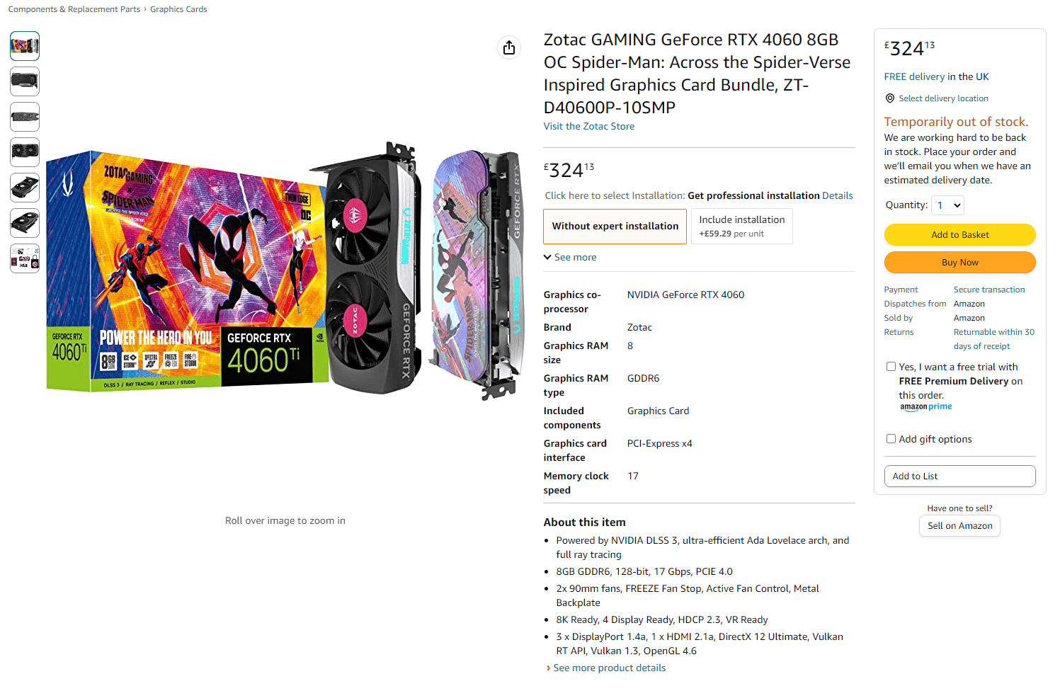 Alongside that, another RTX 4060 has been listed by Zotac. This one, a Spider-Man: Across the Spider-Verse inspired graphics card bundle, incorrectly displays an RTX 4060 Ti on the box, though it’s possible this is just an administration issue.