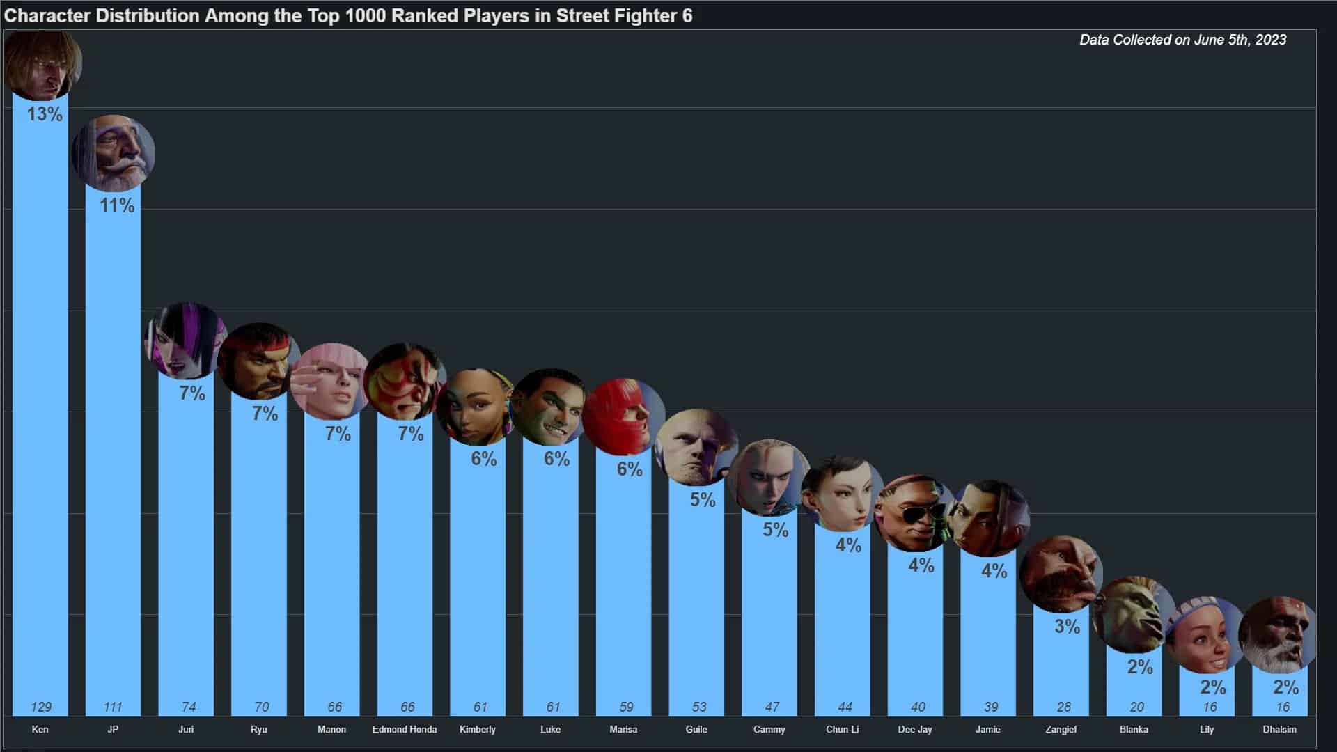 Three of the series’ most iconic characters in Guile, Cammy, and Chun-Li would then finally make their appearances in the bottom half of the distribution chart. They would be followed immediately by Dee Jay and Jamie, both of whom are sitting at 4% as well, but with lower player counts. Finally, the bottom four consists of a handful of iconic characters in Zangief, Blanka, Lily, and Dhalsim, with the latter being the least used fighter in the entire roster.