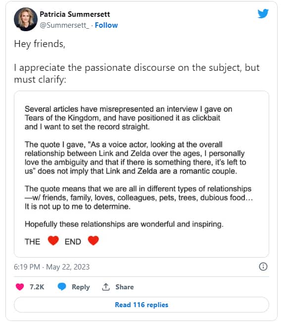 Updated 23 May – Zelda’s voice actress Patricia Summersett has posted a fresh statement clarifying her earlier comments on Link and Zelda’s relationship in Tears of the Kingdom.