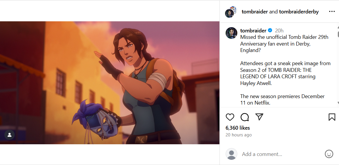 This year Tomb Raider is celebrating its 29th anniversary. Fans in Derby, England, the home of previous developer, Core Designs, were able to attend an unofficial event where they got a glimpse of Tomb Raider Netflix Season 2. Now this “sneak peek” has been shared on Instagram for the entire world to see.