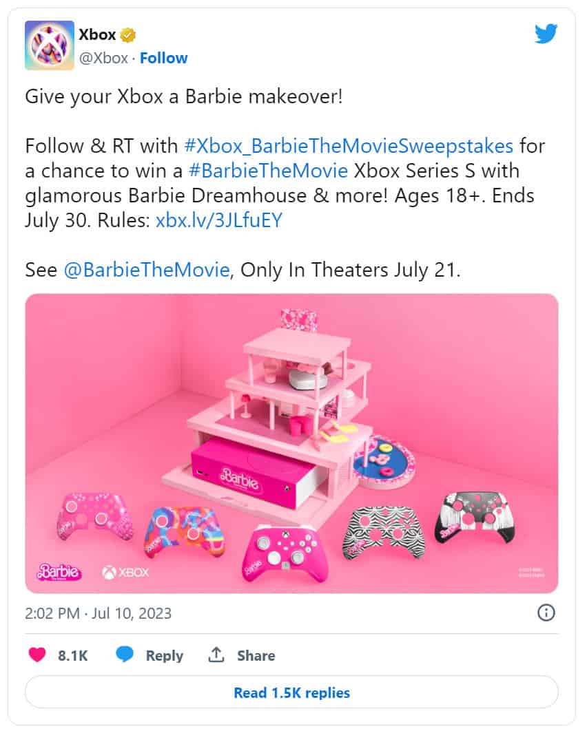 It also wouldn’t be out of the realm of possibility for Barbie either, with the brand making a monumental push to serve the upcoming movie set to release on July 21. This has included reportedly more than a whopping 100 partnerships across many brands, including most relevantly, those in gaming such as Xbox. The console manufacturer has teamed up with Mattel to offer fans a specially Barbie Dreamhouse themed Xbox Series S.