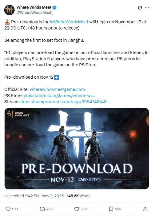 Where Winds Meet will be available to preload on PS5 and PC starting at 2PM PT/5PM ET/10PM GMT on November 12th. The free-to-play open-world epic looks amazing, and the game has exceeded its goal of reaching over 10 million pre-registrations.