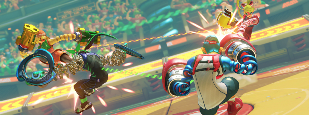 V-Ball is, you guessed it, a mediocre volleyball mode that feels automated. There’s a bog standard wave-based affair in here too, as well as an awfully boring target practice game. Hoops is a basketball mode that’s a little bit better, because the strategy employed in the regular fights is still in play here as you try and grab your rival on the open court, and fire them through the hoop for points. The 2-vs-2 mode and four way dance options are the real duds, though, as it takes away the tactical battles from regular one-on-one matches, instead favouring chaos. You can’t punch one of your opponents without another coming in and grabbing you as your Arm is retracting. Arms normally asks you to react rather than act — but how do you react to two contrasting actions? You fucking don’t. You can’t avoid the shambolic parts of Arms in the game’s ironically named Party Mode, either.