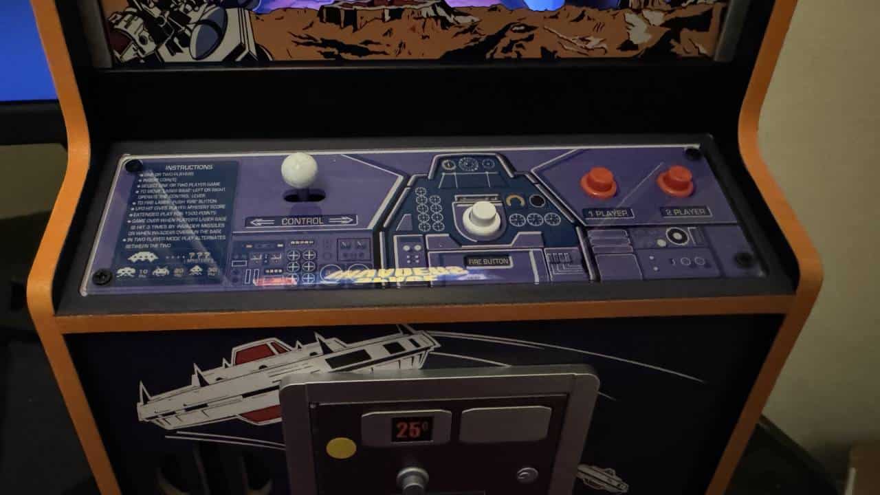 This extends to the controls which are 1:1 with the original cabinet including a white joystick along a horizontal access, a white fire button, and two red buttons for either player one and two. It even extends to the instructions on the left hand side which are copied in full. The coin slot is also accurate, save for the fact that there’s no need to pour quarters into the coin slot.