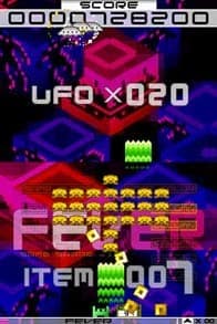 Numerous score building opportunities crop up as you play. A multiplier that increases to a maximum of 10 is your key to a massive score, but it’s reset to zero if your cannon is wiped out. There’s also a chain system, with 100 ships destroyed in a single chain (chain depletes over time) activating a break state, in which the score multiplier is raised to 16. Losing all your lives means it’s game over (you can retry but it’ll reset your score), so earning more will help you out immensely. By performing 10 sequences (shooting a series of ships of the same colour or shape, or in a row or column) you’ll earn an extra life.